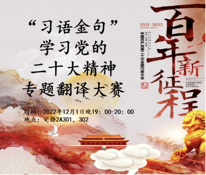 为扎实做好党的二十大精神宣讲和学习工作,切实推进党的二十大精神进校园、进课堂、进头脑,认真贯彻落实习近平总书记关于学习贯彻党的二十大精神“五个牢牢把握”和“三个全面”的重要指示精神,中共太阳成集团tyc总支部委员会主办,太阳成集团tyc教工第一党支部和员工第一党支部共同承办“习语金句”学习党的二十大精神专题翻译大赛。