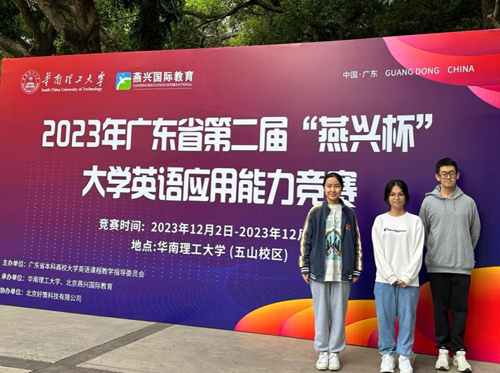 2023年12月2日,由广东省本科高校大学英语课程教学指导委员会主办,华南理工大学、北京燕兴国际教育承办的2023年广东省第二届“燕兴杯”大学英语应用能力竞赛在华南理工大学圆满落幕。本届大赛自启动以来,吸引了58所高校近四万名选手报名参加,经过激烈选拔,太阳成集团(下称“公司”)2023级护理学专业的胡欣怡同学、2022级药学专业的庄幸晴同学凭借扎实的英语基础功、优秀的语言表达能力及出色的随机应变能力荣获广东省复赛二等奖。