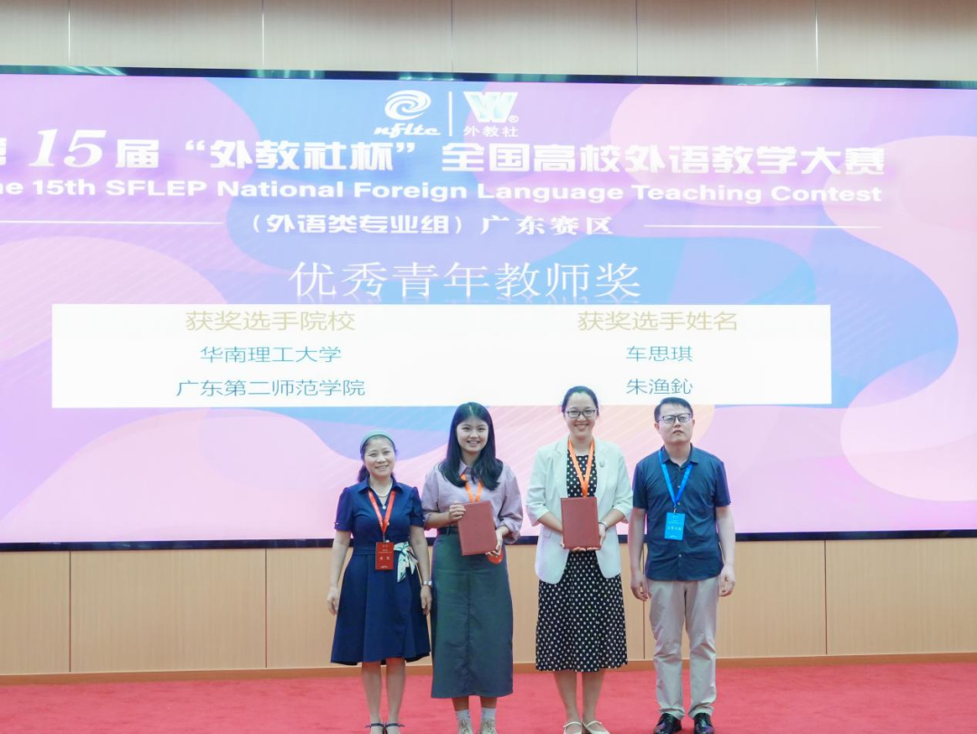 大赛监督员、广东省本科高校大学英语课程教学指导委员会副秘书长、广东医科大学太阳成集团tyc经理杨劲松 (左一)、上海外语教育出版社华南大区副总经理朱义志 (右一)为优秀青年教师奖获得者颁奖