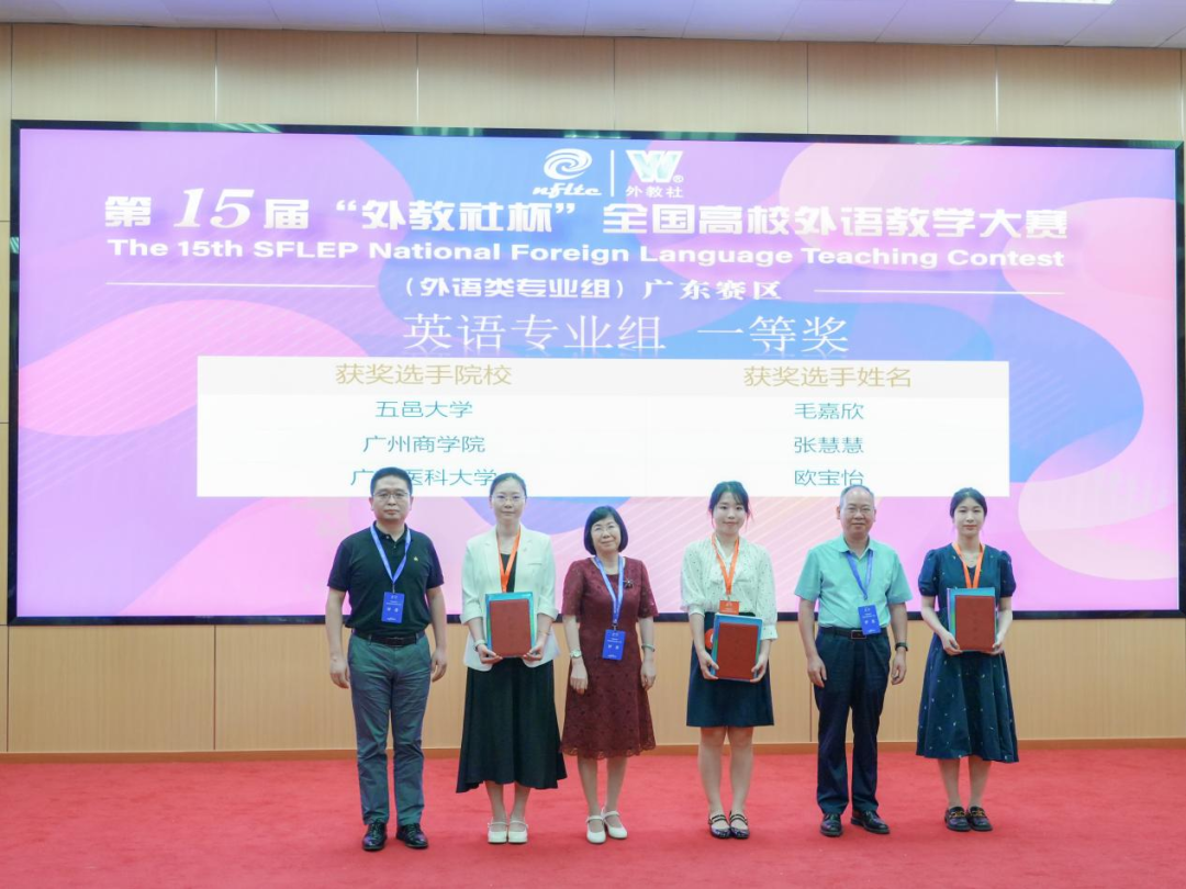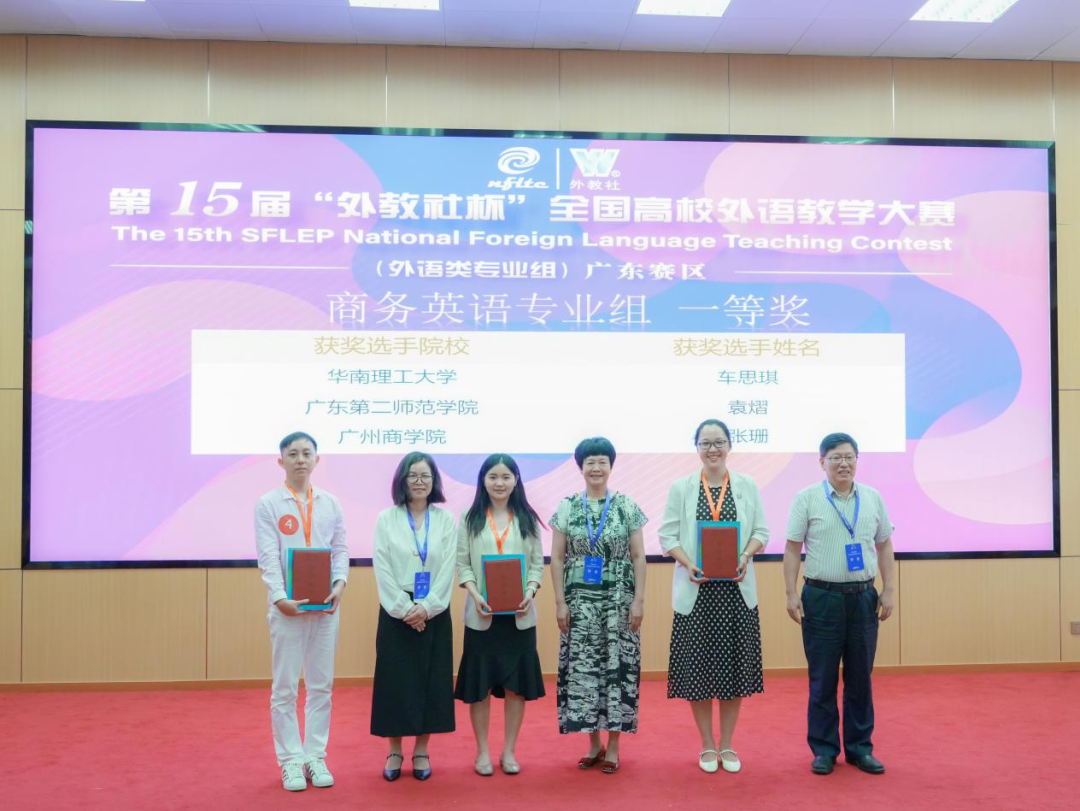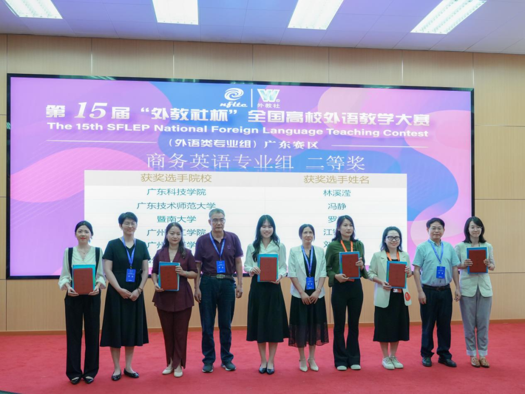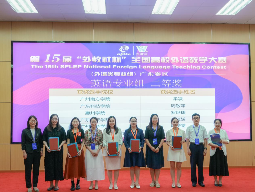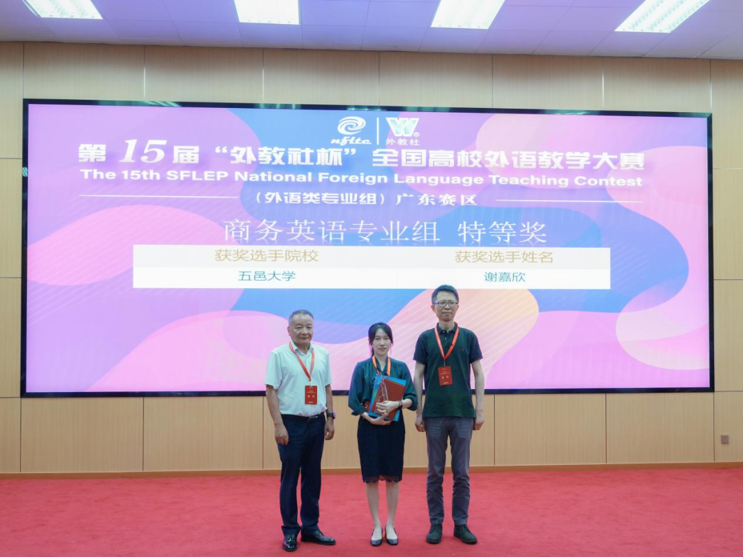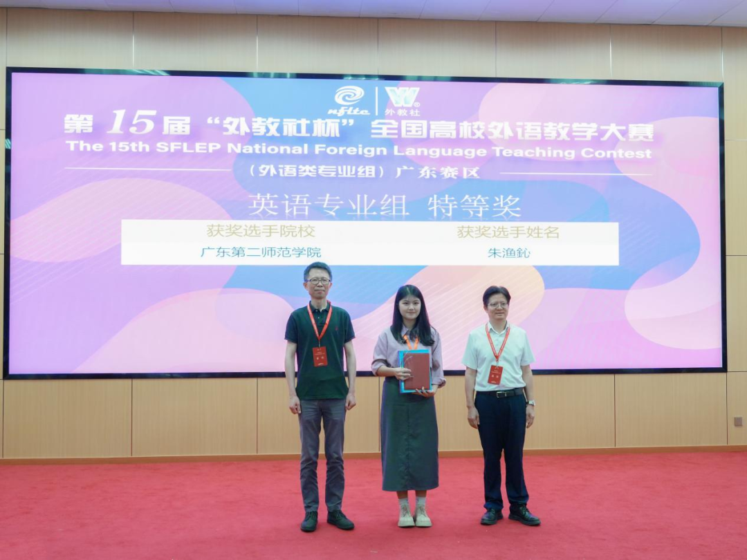 经过激烈角逐,来自广东第二师范学院的朱渔鈊、江门五邑大学的谢嘉欣脱颖而出,分别获得英语专业组和商务英语专业组特等奖。两位选手将代表广东省登上“外教社杯”全国高校外语教学大赛总决赛的舞台。