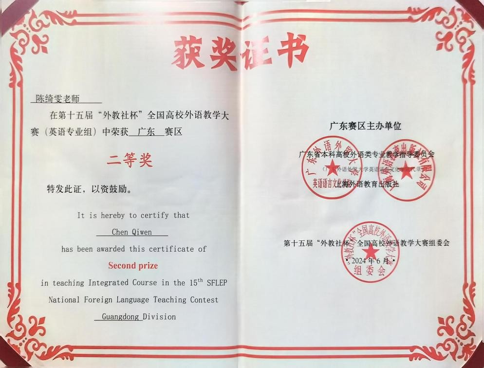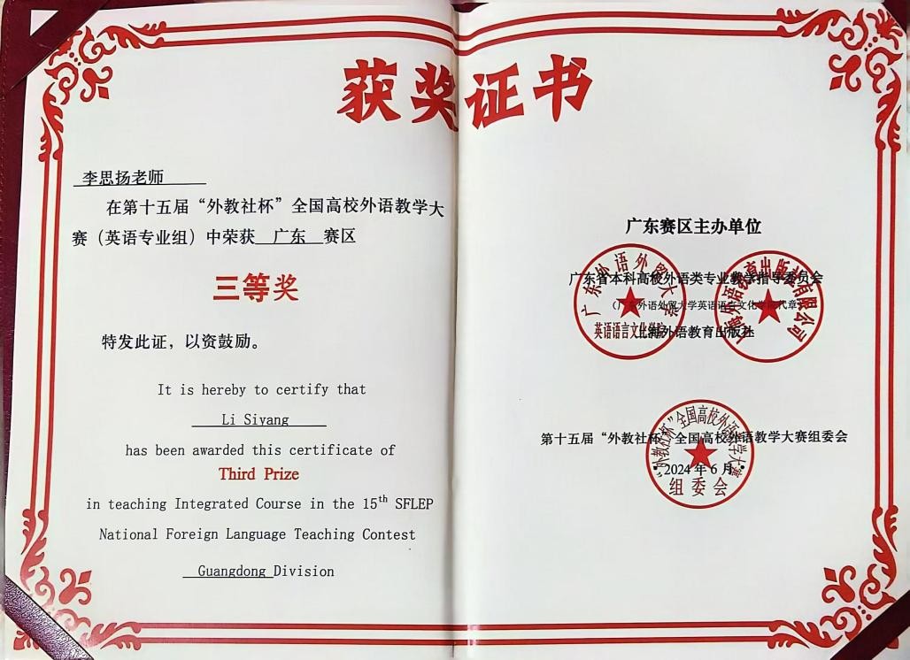 另外,公司教师李思扬老师获得第十五届“外教社”杯全国高校外语教学大赛(英语专业组)广东赛区三等奖。两位老师充分展现了新华外院教师的优秀教学风采。