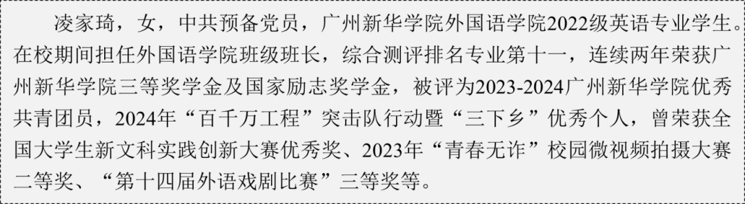 凌家琦同学在大学期间,不仅在学业上取得了优秀成绩,更在个人成长和全面发展上得到快速提升。她深刻理解到,新时代的老员工不仅要有扎实的专业知识,还要有全面的素质和能力。因此,她积极参与各类竞赛活动和社会实践,不断提升自己的团队协作能力和创新能力。