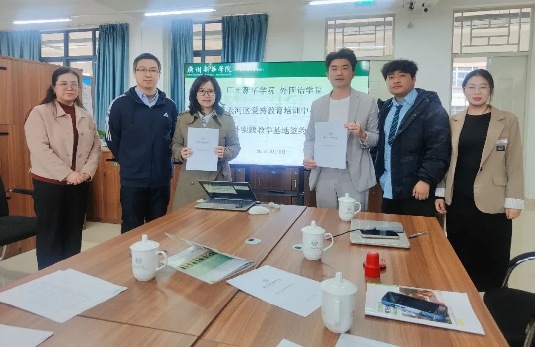 爱秀集团人事经理兼爱秀国际英语番禺校区董事长秦伟(右三),业务总监黎仁河(右二),人事专员黄建明(右一)签订校外实践教学基地协议