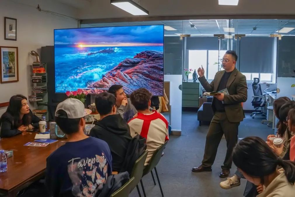 前海万美文化发展有限公司是外院2009届员工吴建鹏先生创立,主要从事翻译、文化活动、艺术、及AI科技等业务。当天一行人来到深圳前海万美文化发展公司进行交流学习,公司刘奕廷设计师向我们阐述了她对创意设计的理解和商业化实践经验,设计鼓励同学们可以多看、多学、多实践,有想法就尝试去做,这是成功的第一步。随后,同学们也就丝绸之路文化产品设计提出自己的问题以及交流创新想法。