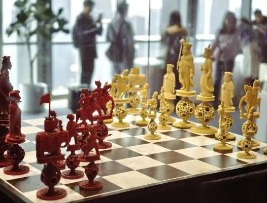 图|贝母染色骨牙片贴面双面绘港口折扇、镂空骨雕国际象棋