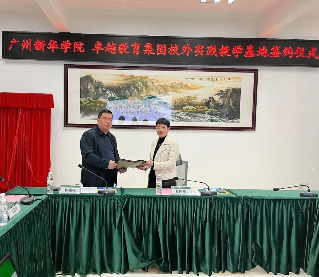 集团董事长助理、教务处处长蔡映辉(右)与卓越教育集团中山分校人力行政部经理黎锡强(左)签订校外实践教学基地协议
