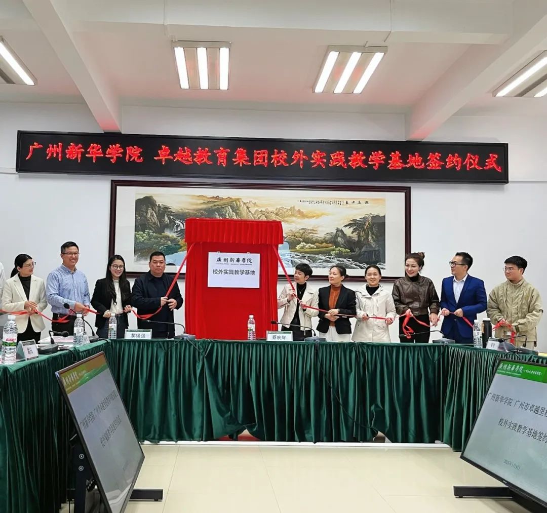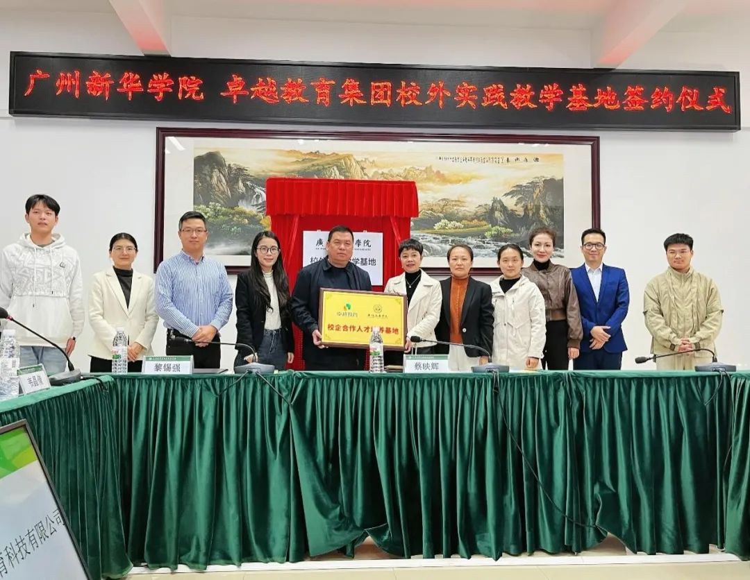 太阳成集团董事长助理、教务处处长蔡映辉(右6);卓越教育集团中山分校人力行政部经理黎锡强(左4) 为校外实践教学基地揭牌