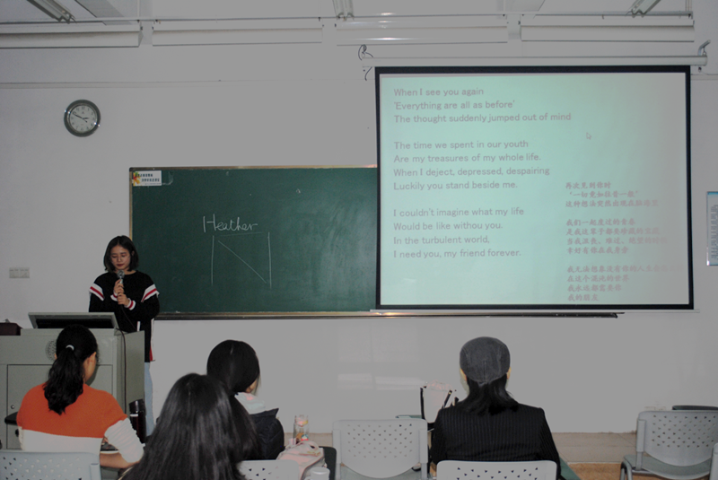 在同学们诗歌分享的过程中,Ellen老师对诗歌进行了点评,同时也为同学们讲述了许多外国诗人的事迹和相关著作。Ellen老师与同学们之间精彩的互动使朗诵会充满欢声笑语。