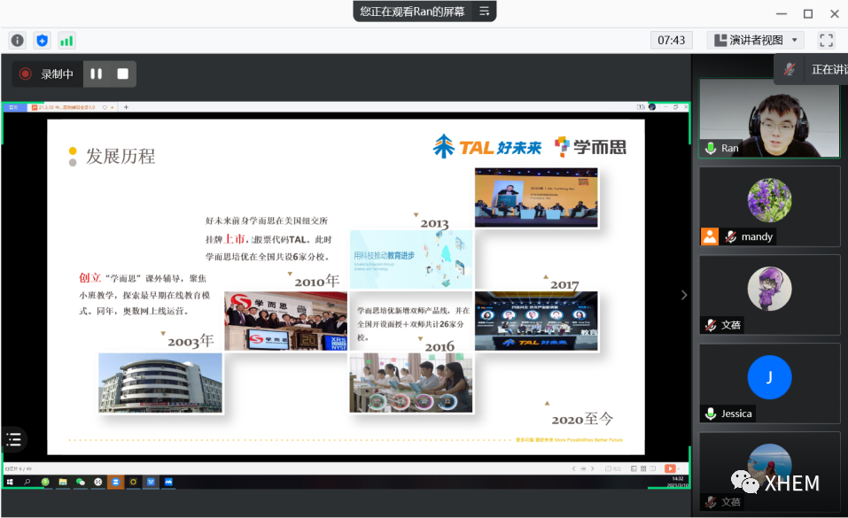 首先,学而思培优网课广州基地选培总负责人高冉主管向公司领导和教师介绍了学而思的企业发展历程。他表示,广州是学而思培优五大辅导教师基地之一,在2017年5月成立。高主管希望能够与公司建立长期稳定的合作关系,定期从外院的员工中挑选优秀的实习生和毕业生担任网课辅导教师。集团也会为同学们提供专业的系统化培训,包括线上的岗前培训以及线下岗后系列培训。