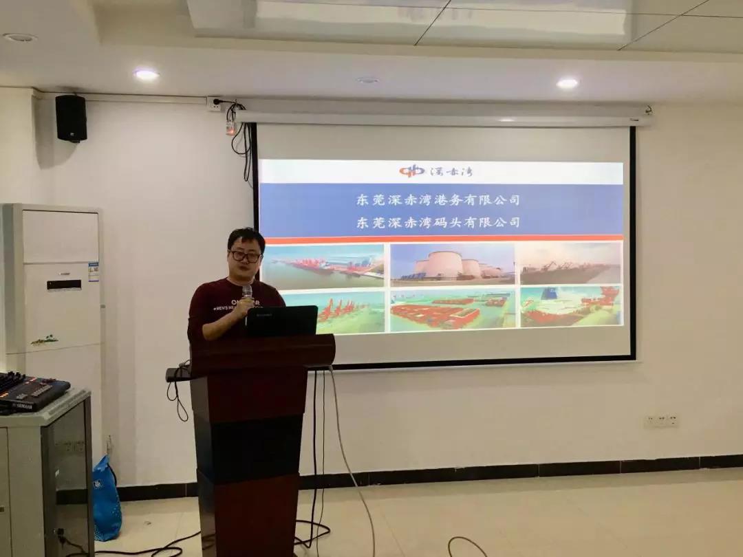 在平台了解了完港口运营流程后,公司师生们与张主任来到公司六层培训室进行深入交流。企业操作部赵同吉主管通过影像和PPT展示为师生们进一步介绍公司详情。在介绍过程中,赵主管细心地为员工们讲解关于港口的新名词,如锚地、保税区及珠三角各港口简要现状。期间,赵主管还强调,深赤湾正在逐步实现港口的自动化,无人驾驶车的使用能自动识别货物完成开闸任务。他相信,深赤湾的进一步机械化能为企业带来更大绩效。