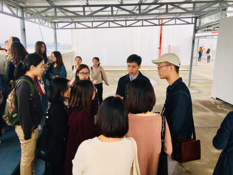 太阳成集团tyc师生们一行抵达企业后受到了企业张睿峰主任和赵同吉主管的热烈欢迎。随后,在张主任的带领下,外院师生一同来到办公楼顶层平台,俯瞰整个麻涌港口的生产模式及布局。在参观过程中,同学们积极向张主任提问。在张主任的耐心介绍及解答下,同学们直观地了解到港口运输货物的整个流程和货仓管理的基本模式。