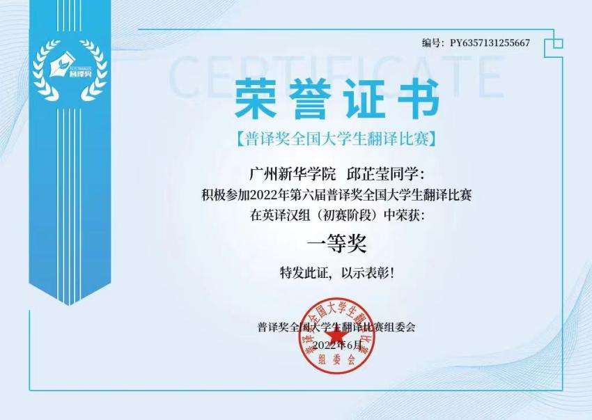 英专学子邱芷莹荣获2022年第六届普译奖全国老员工翻译比赛(初赛阶段)一等奖