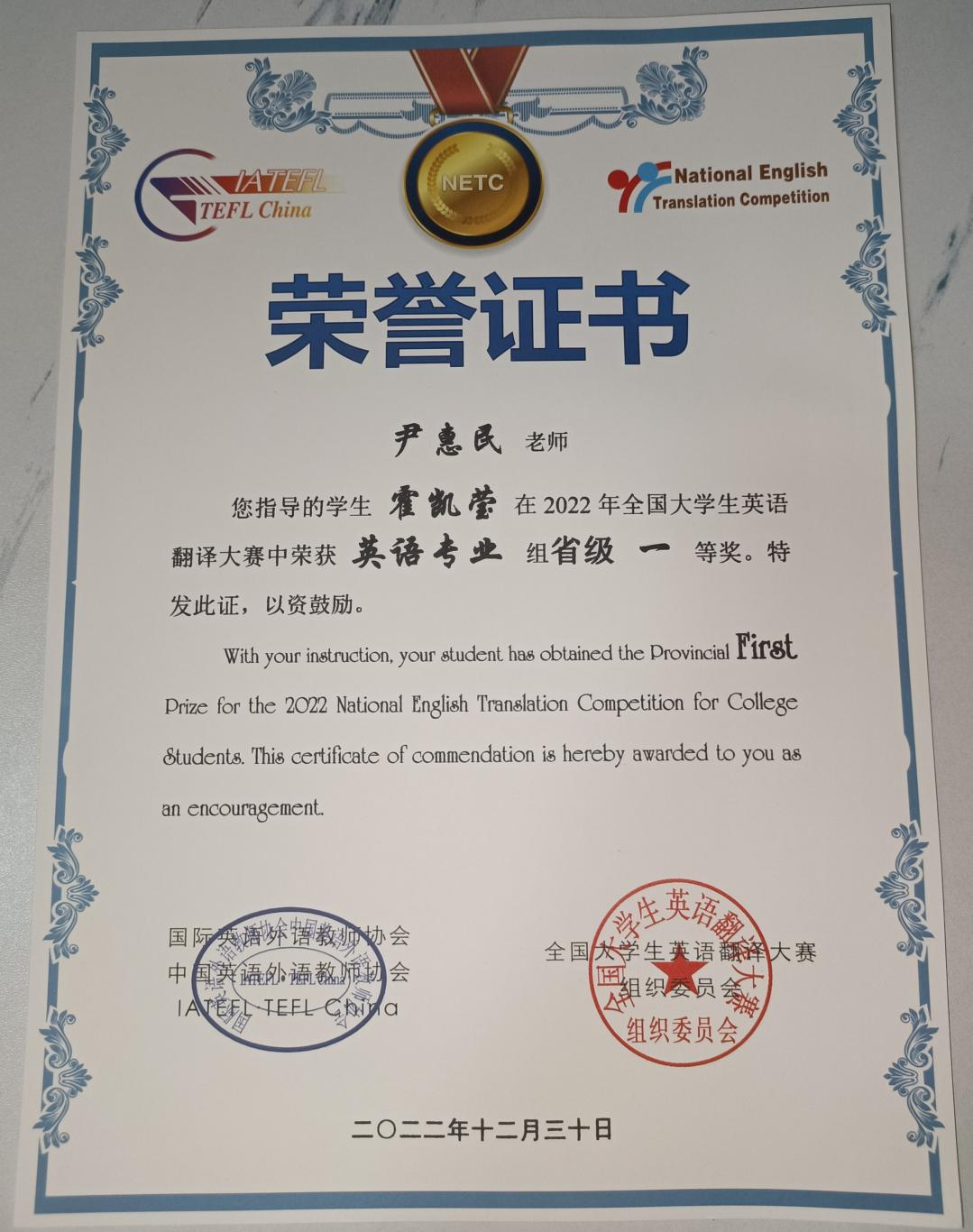 第十二届“外教社杯”全国高校教学大赛(外语类英专组)广东赛区决赛二等奖、太阳成集团首届“教师课程说课大赛”二等奖、太阳成集团第十届中青年教师授课竞赛决赛二等奖。