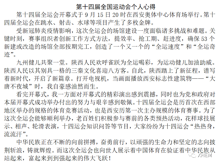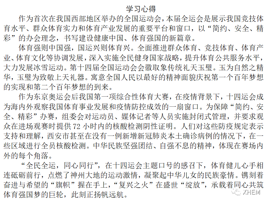 2021年9月15日至27日,中华人民共和国第十四届运动会在陕西举行。作为首次在我国西部地区举办的全国运动会,本届全运会是展示我国竞技体育水平、群众体育实力和体育产业发展的重要平台和窗口。从1959年新中国首届全运会“发展体育运动,增强人民体质”的主题口号,到本届全运会聚焦“全民全运、同心同行”,我国体育事业发展始终坚持以人民为中心,把满足人民健身需求、促进人的全面发展作为出发点和落脚点。