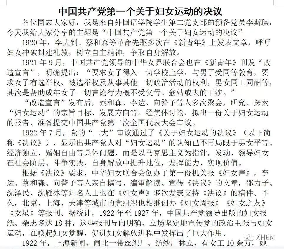 下面由李斯琪同志带你了解“中国共产党第一个关于妇女运动的决议”